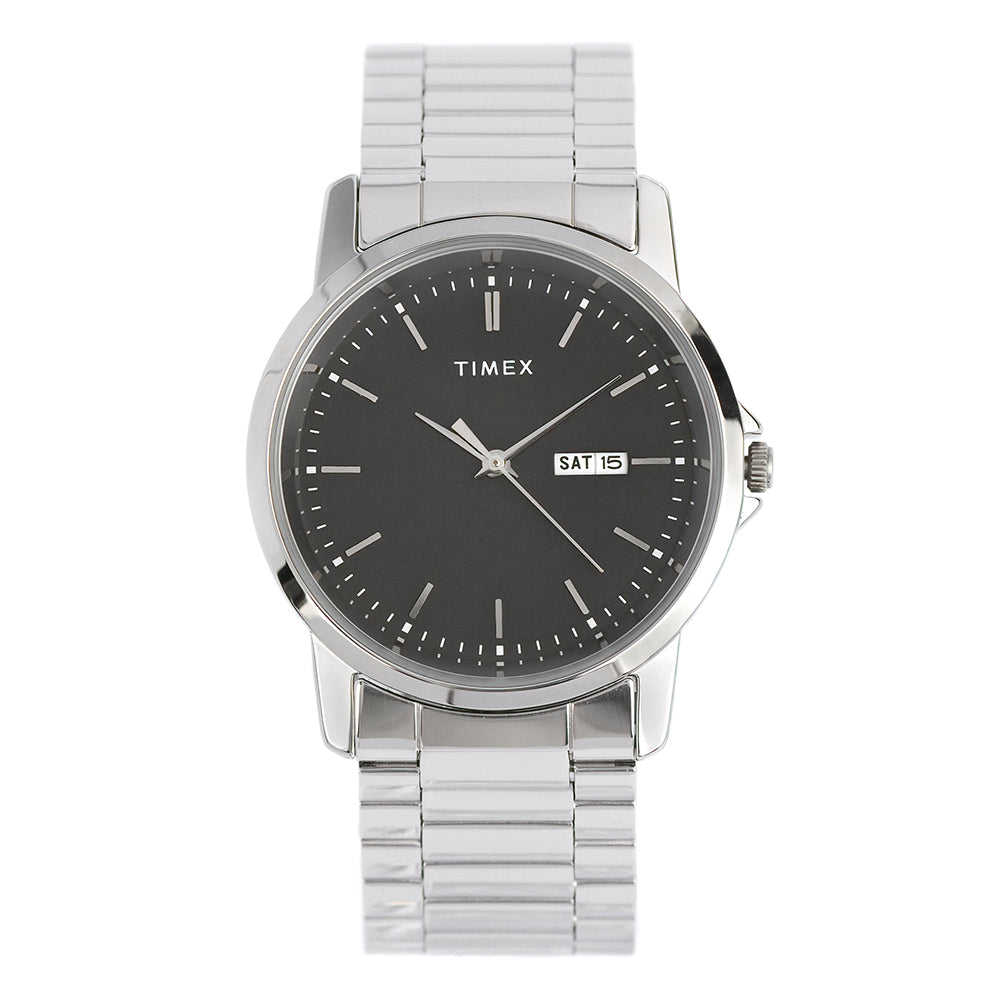 Elevate your look with this Timex dress watch, showcasing a 40mm silver-tone case and a sleek black dial with three hands. The day and date indicator adds practicality to its timeless design, making it the perfect blend of style and functionality.