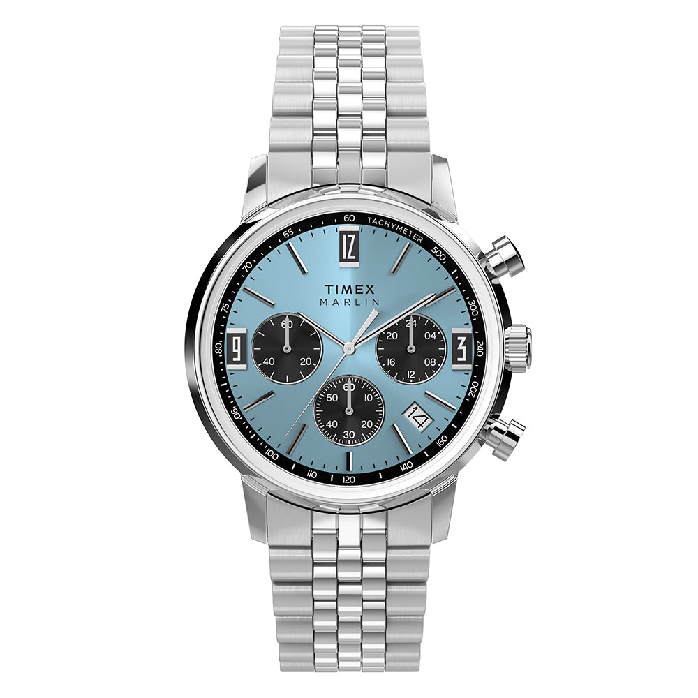 Our Marlin Quartz Chronograph Tachymeter boasts the distinction of being the first chronograph in our Marlin line, as well as the first Marlin powered by a quartz movement. This beautifully detailed rendition features a brilliant ice blue dial, as well as a tachymeter index along its outer minute track to measure speed, a unique date window placement, and a silver-tone stainless-steel bracelet with quick-release spring bars. Though its build broke new ground in our watchmaking heritage, this timepiece retains the classic Marlin features with a sturdy recycled stainless-steel case, a domed acrylic crystal, and retro-style square markers at 3, 9, and 12 o'clock.