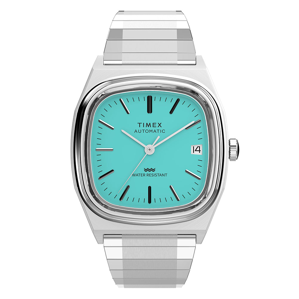 Originally unleashed onto the scene in 1983, the Timex Automatic 1983 E Line was a classic dress watch distinguished by a rounded square case shape affectionately dubbed the ‘TV Dial.’ This fun color update features a brushed and polished stainless-steel case and coordinating expansion band enhanced with our Perfect Fit technology. It's powered by a Miyota caliber 8215 Japanese automatic movement with 21 jewels, and completing its smooth profile is a vintage-style flat acrylic crystal, distinct applied hour markers, a simple printed minute track, and a discreet date window seamlessly integrated into the light blue dial at 3 o’clock.