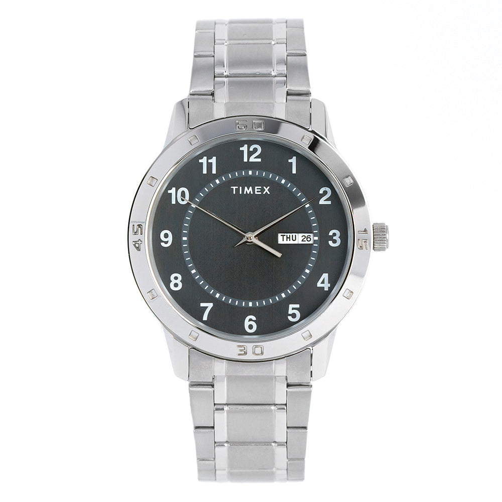 Combining rugged appeal with timeless design, this 40mm Timex boasts a silver-tone case and bracelet, and a minimalist black dial with three hands. The day and date indicator offers added convenience, perfect for an active, on-the-go lifestyle."