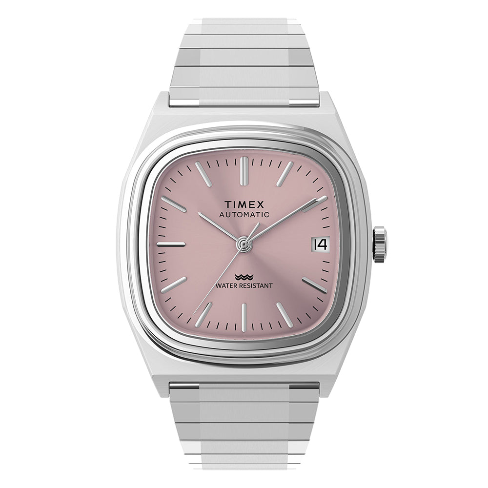 Originally unleashed onto the scene in 1983, the Timex Automatic 1983 E Line was a classic dress watch distinguished by a rounded square case shape affectionately dubbed the ‘TV Dial.’ This thoughtful color update features a brushed and polished stainless-steel case and coordinating expansion band enhanced with our Perfect Fit technology. It's powered by a Miyota caliber 8215 Japanese automatic movement with 21 jewels, and completing its smooth profile is a vintage-style flat acrylic crystal, distinct applied hour markers, a simple printed minute track, and a discreet date window seamlessly integrated into the light pink dial at 3 o’clock.
