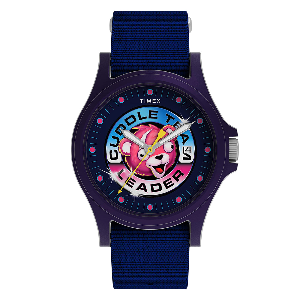 The Timex x Fortnite collection brings the hype with this epic update to our Acadia watch. With an ultra-lightweight 40mm resin case for a barely-there feel during gameplay, it levels-up your style with an electric yellow second hand, a handy date window, and the infamous Cuddle Team Leader on its dial. A recycled plastic fabric slip-thru strap lets you swap colors and styles like a fresh skin, and if your gameplay takes you into the night, simply push the crown to activate the INDIGLO® backlight. To top it off, the custom-engraved case back reps both the Timex and Fortnite names in true victory-royale style. Round up your squad, join the action, and let your adventures extend beyond the screen; the battle is on.