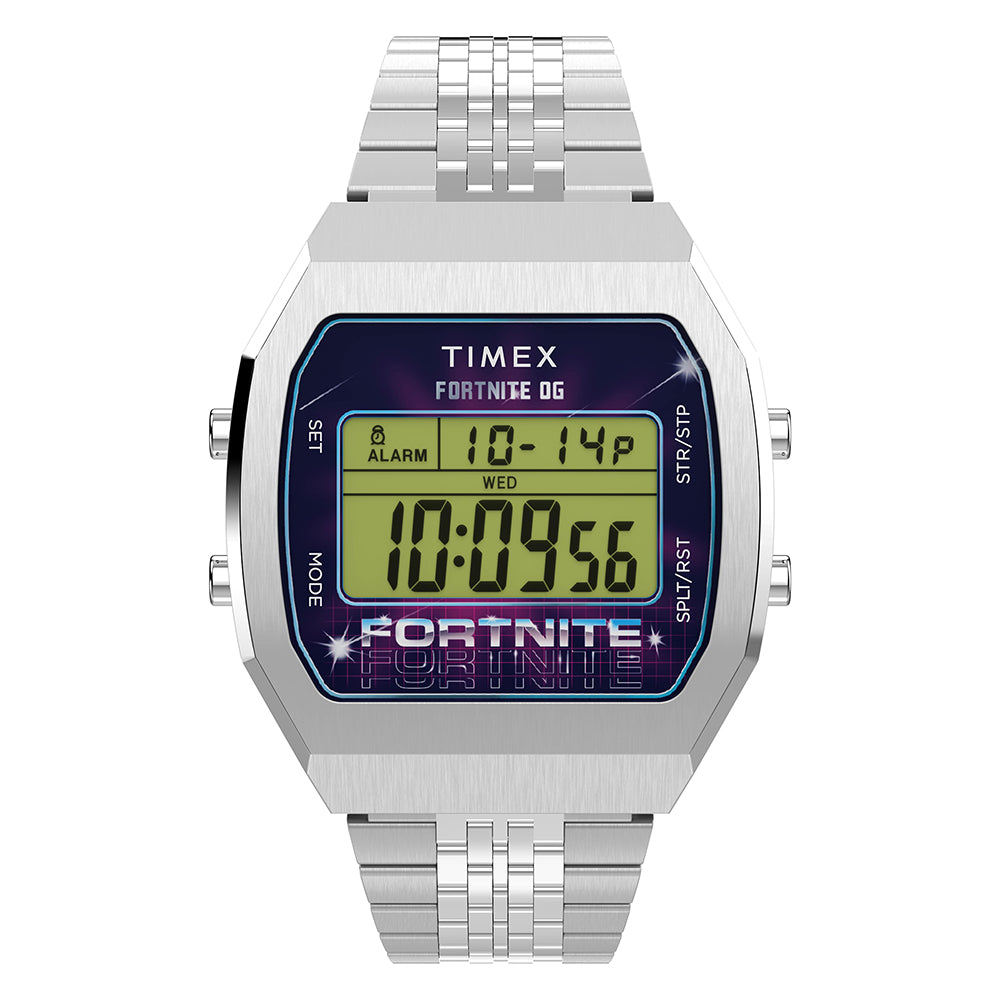 The Timex x Fortnite collection brings the hype with this epic update to our retro-style T80. It includes all the features you already know and love, but we’ve customized it with the iconic Fortnite logo front and center beneath the digital display. The 36mm stainless-steel case and bracelet bring the shine, while the custom-engraved case back reps both the Timex and Fortnite names in true victory-royale style. Round up your squad, join the action, and let your adventures extend beyond the screen; the battle is on.