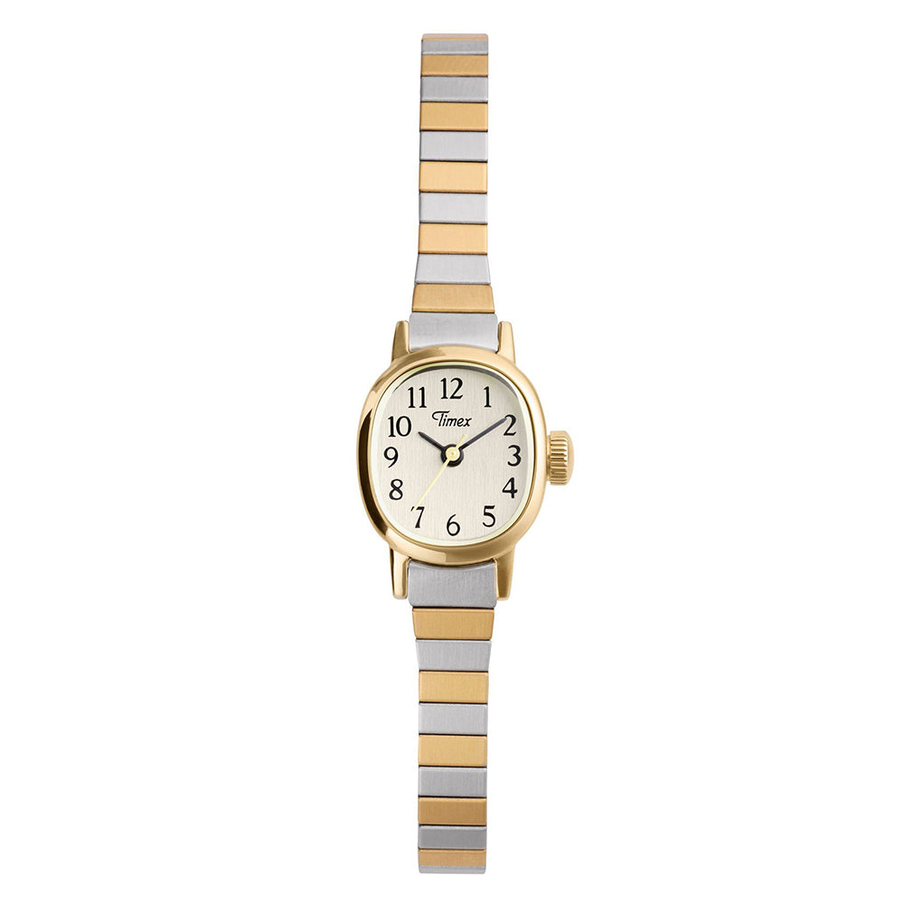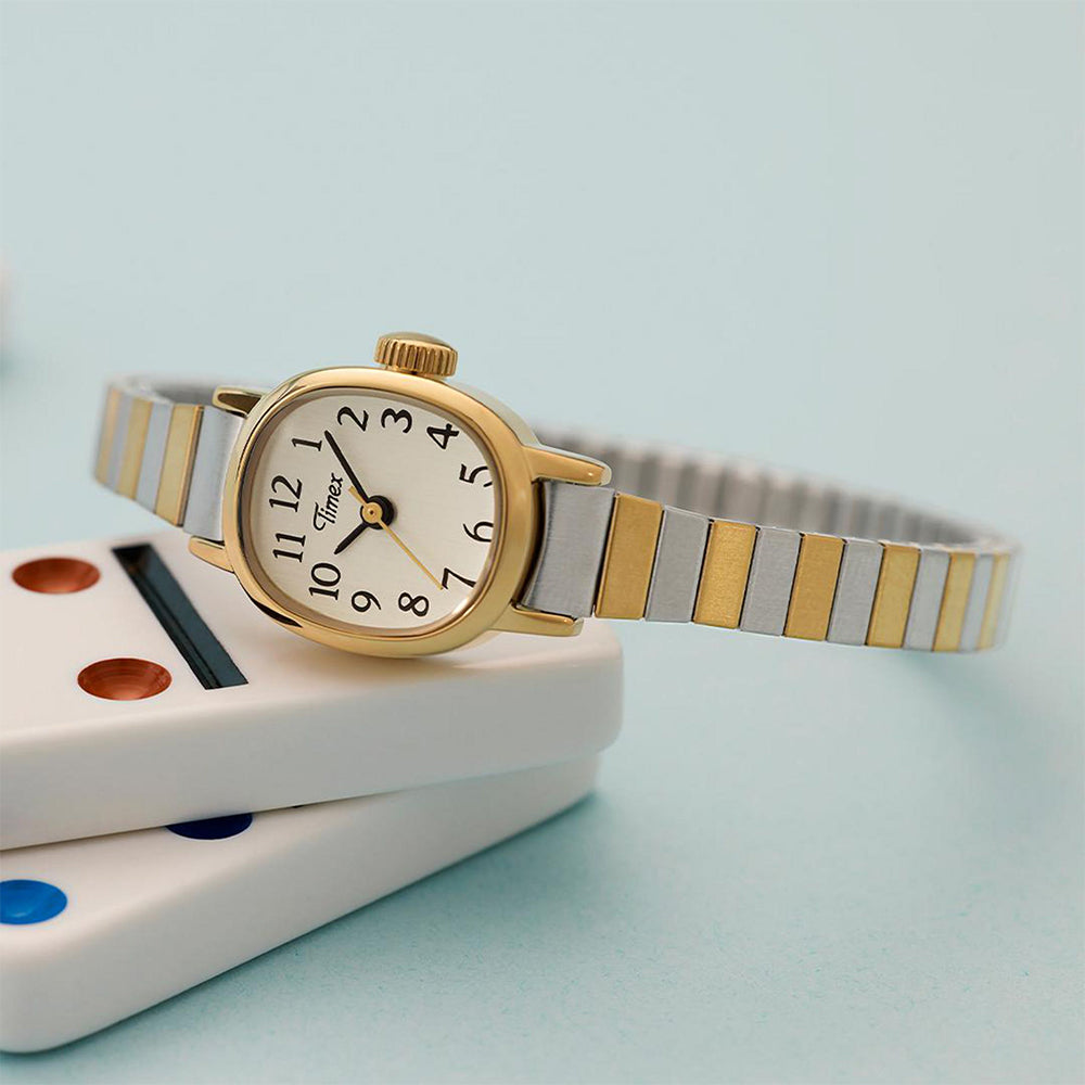 Your favorite retro-style mini watch just got even smaller. This update to our Cavatina pays homage to our watchmaking legacy while embracing a fresh, modern aesthetic. Remaining faithful to its petite roots, it features an even smaller 17mm polished stainless-steel case in a classic cushion shape and a domed mineral glass crystal that whispers a timeless elegance on the wrist. A soft champagne dial with vertical brushing, a '60s script-style Timex® logo, and full Arabic numerals keeps things clean and classic, while the brushed stainless-steel expansion band completes the look.