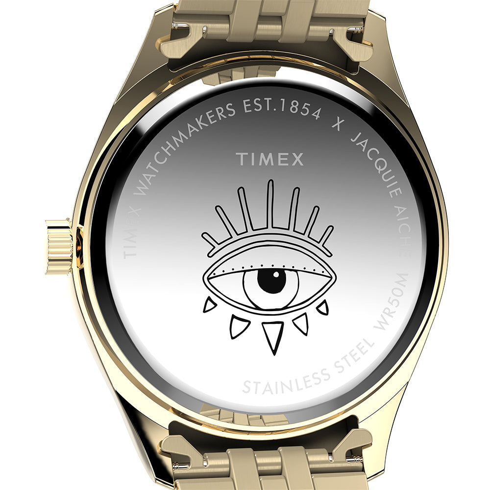 Designed to radiate vibrant energy and protection, the Timex x Jacquie Aiche Guiding Light timepiece brings Jacquie’s signature eye motif to life on a striking black dial adorned with rainbow-hued crystals. Matching rainbow crystals also surround the bezel, creating a dazzling halo of colour, while faceted stones mark each hour. Each faceted crystal is carefully cut and hand-set to maximize its brilliance, giving the watch a breathtaking sparkle. The 36 mm gold-tone stainless-steel case and matching bracelet complete the look, adding a rich, luminous finish to your wrist.