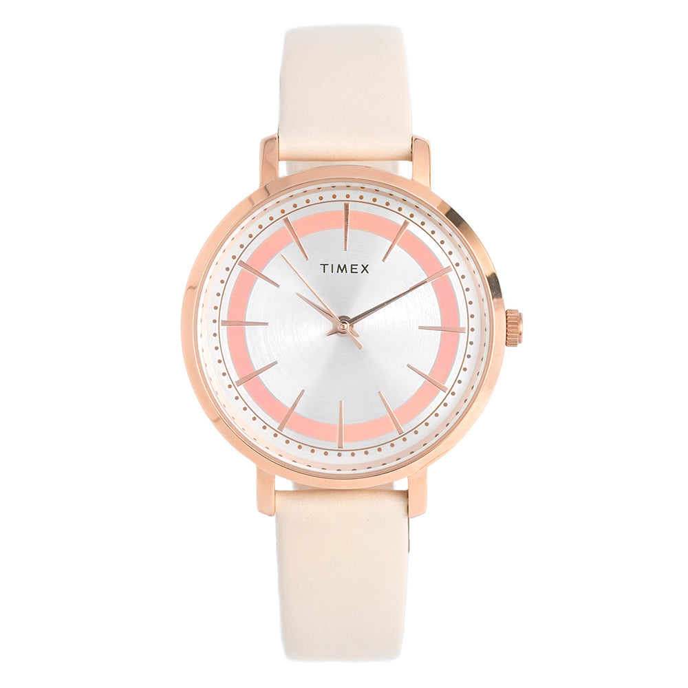 A stylish women's watch featuring a 34mm rose gold-tone case, a minimalist dial, and soft pastel-colored leather strap, offering a perfect blend of modern elegance and subtle charm.
