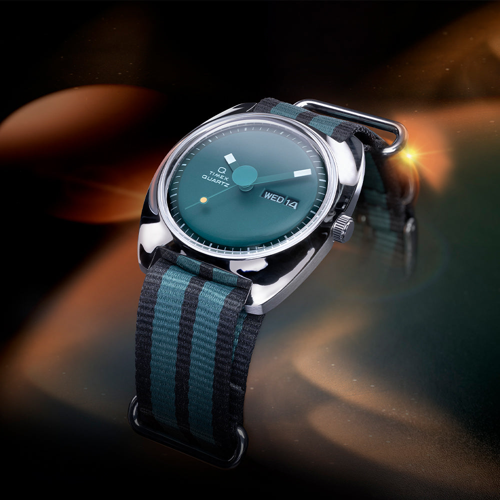 Born of a vision to craft an illusion of floating hands, a green dot cleverly painted on the underside of the crystal cleverly conceals the main hub on this reissue-inspired timepiece. The hands—also painted green—seamlessly blend with the dial to enhance the illusion of their white and yellow details mysteriously floating. Completing the sleek build of this timepiece is an ultra-precise quartz movement, a 37mm stainless-steel case in an elongated cushion shape, day and date window, a domed acrylic crystal that brings depth and dimension, and a recycled plastic fabric slip-thru strap.