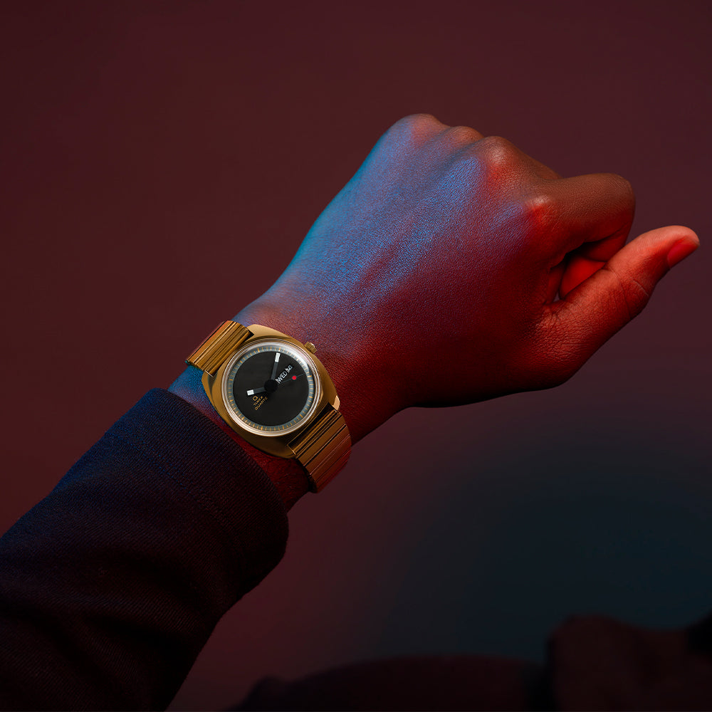 Born of a vision to craft an illusion of floating hands, a black dot cleverly painted on the underside of the crystal cleverly conceals the main hub on this reissue-inspired timepiece. The hands—also painted black—seamlessly blend with the dial to enhance the illusion of their white and red details mysteriously floating. Completing the sleek build of this timepiece is an ultra-precise quartz movement, a 37mm stainless-steel case in an elongated cushion shape, day and date window, a domed acrylic crystal that brings depth and dimension, and a brushed stainless-steel bracelet.